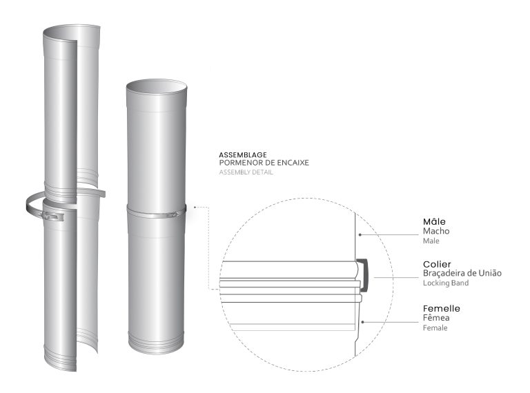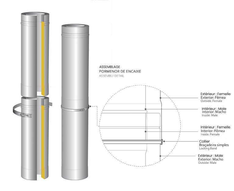 As nossas chaminés modulares em aço inoxidável foram projetadas para atender às mais altas exigências de qualidade e eficiência. Elas utilizam um avançado sistema de encaixe macho/fêmea Click-Clac, que proporciona uma montagem simples, rápida e segura, eliminando a necessidade de braçadeiras de união adicionais. Esse sistema inovador não apenas garante uma vedação perfeita, mas também reduz o tempo e o esforço necessários durante a instalação, tornando o processo mais prático e eficiente.